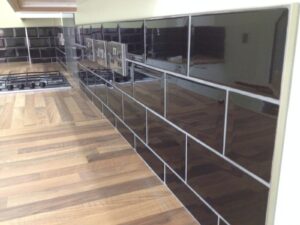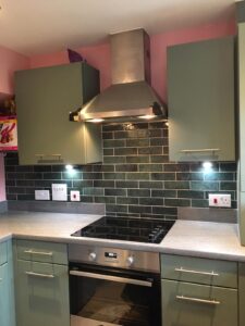 These are pictures of various kitchen tiling projects using ceramic tiles installed above the work tops, a tile trim is applied to the tile edge where applicable, and a compatible grout colour of the customers choice is used.